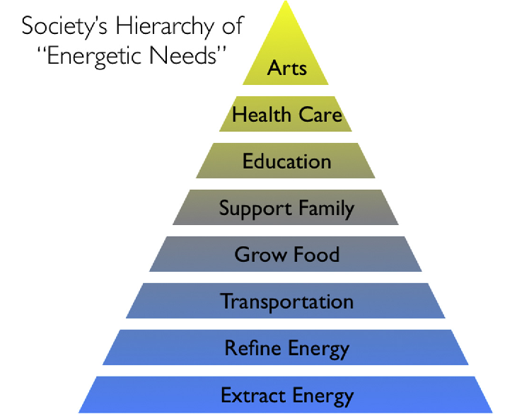 Tornando al nostro racconto dell’uomo primitivo che uccide la sua preda per mangiarla: abbiamo visto che per sopravvivere occorre ricavare dalla preda più energia di quella che serve per ucciderla. Secondo alcuni studiosi, al di là della pura sopravvivenza, anche il livello di benessere delle persone dipende dall’energia disposizione, e EROI è un modo per misurarla. Alcuni hanno disegnato una piramide in cui le diverse attività di una società sono messe in relazione con EROI (J.C.Lambert et al., “EROI of different fuels and the implications for society”, Energy Policy Vol.64 (2014). In questa figura si rappresenta l’idea che le attività più complesse sono possibili soltanto se l’energia a disposizione è abbastanza a buon mercato, e – si intende, soprattutto a livello energetico. Un argomento su cui occorre riflettere anche per il futuro.