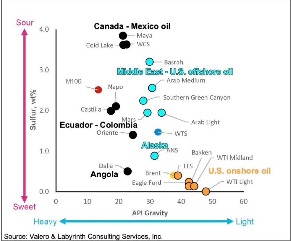 Nella Figura che segue i diversi tipi di petrolio prodotti nel mondo vengono suddivisi, considerando il contenuto percentuale di zolfo e il grado API. La maggior parte del petrolio prodotto negli Stati Uniti, compreso il petrolio di Scisto (Shale Oil) e il Brent che proviene dal Nord Europa, sono leggeri (pallini arancioni). Il petrolio prodotto in Arabia Saudita, in Iraq e in Alaska è più pesante (pallini azzurri), con contenuto di zolfo più basso. Molti tipi di petrolio che proviene da Canada, Messico, Sud America, Africa Occidentale sono pesanti (pallini neri).