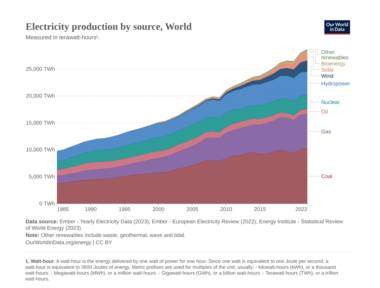 Il grafico mostra che il consumo di elettricità nel mondo dal 1985 è triplicato ed evidenzia con i diversi colori come è stata ottenuta (i dati relativi al 2023 saranno disponibili tra pochi mesi).