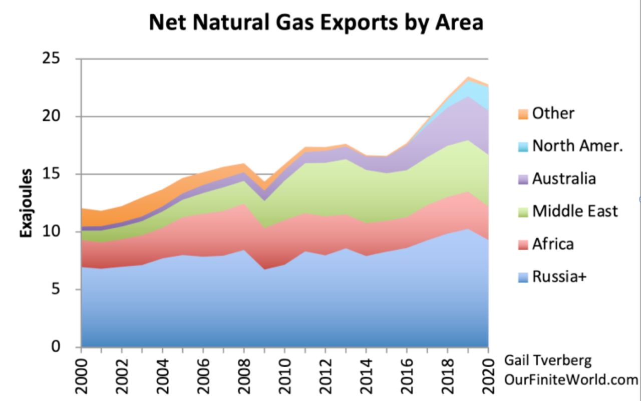 Secondo alcune analisi però sarebbe bene non dimenticare la questione energetica. A quanto sembra, la maggior parte delle persone in America e in Europa stanno sottovalutando l’importanza dei combustibili fossili che provengono dalla Russia. Nella figura qui di seguito, che proviene dal blog di Gail Tverberg, sono illustrate le esportazioni di gas da parte dei diversi produttori.