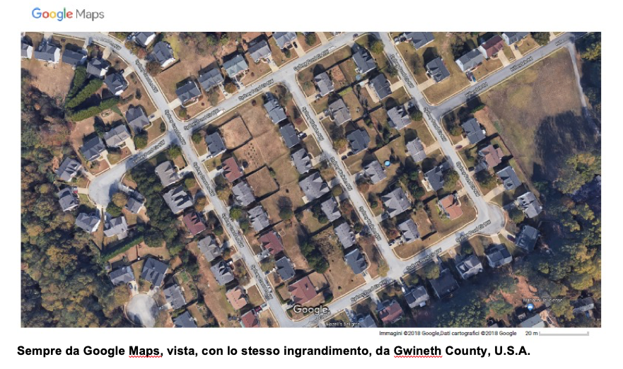 Confrontiamo qui di seguito la vista dall’alto, ad esempio, di un Comune dell’Oltrepo’ Pavese con quella di un sobborgo di una città americana: nel sobborgo americano le case sono tutte uguali – o quasi. Le strade disegnate geometricamente; non ci sono negozi, né una chiesa, o una scuola, o un ufficio postale.