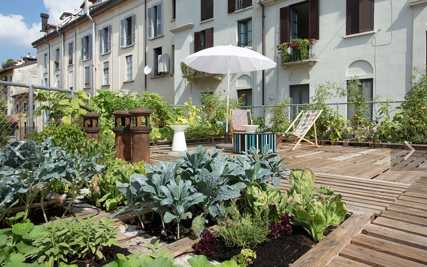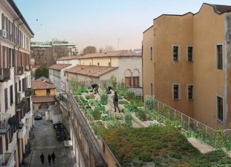 L’Orto fra i cortili è molte cose in una: progetto di riqualificazione energetica dell’edificio, strumento paesaggistico, decorativo, di autoproduzione alimentare, nuovo spazio di rappresentanza, socialità e coworking per chi lavora nell’edificio. Le piante creano un ecosistema che favorisce la biodiversità, riduce la filiera alimentare e garantisce la genuinità dei prodotti. Lo strato di vegetazione migliora l’isolamento e incrementa l’inerzia termica dei locali sottostanti. Il sistema a pallet permette inoltre un controllo delle acque piovane, riducendo il flusso delle acque di scarto che entrano nel sistema cittadino.