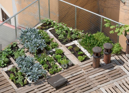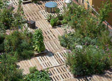 Al centro di questo concept c’è l’ideazione di un sistema modulare che utilizza i pallet per costruire strutture facilmente assemblabili che coniughino estetica e funzionalità, a costi ragionevoli. L’Orto tra i cortili non vuol’essere un’esperienza singola ma piuttosto un sistema ripetibile su ampia scala per riqualificare superfici non utilizzate. I pallet sono usati sia come piano di calpestio che, rovesciati, come contenitori per il terreno. In questo modo, con l’impiego di un unico elemento modulare si costruisce il layout dell’orto.