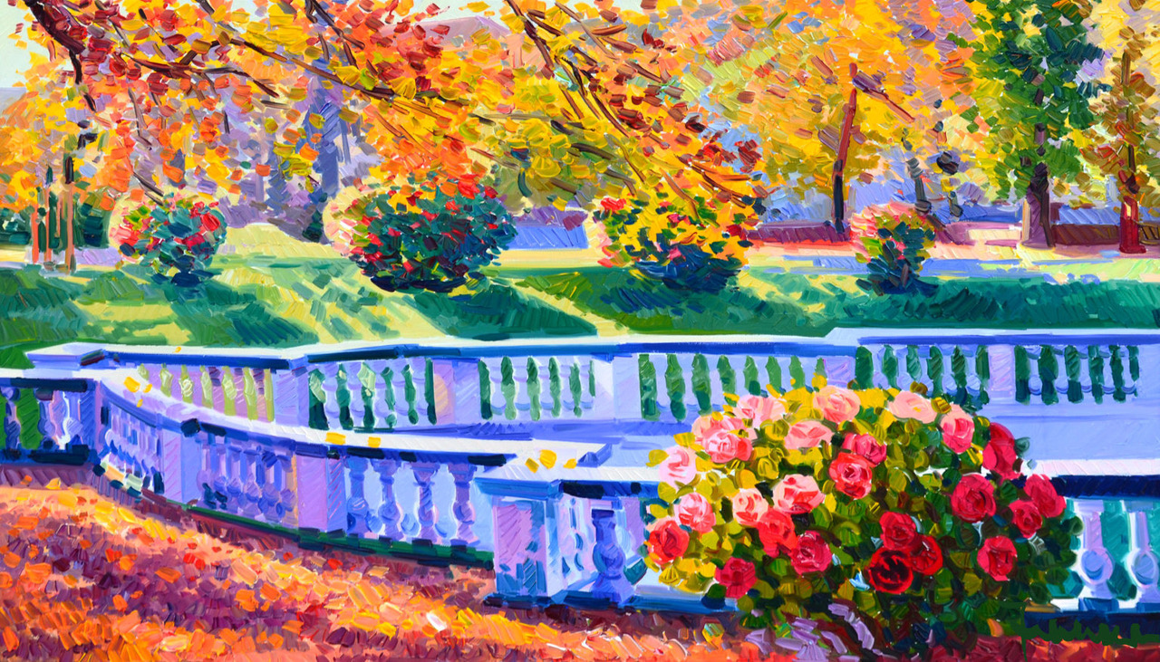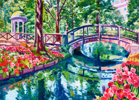 In mostra i sette lavori inediti ad olio su tela offrono vedute di Milano attraverso scorci idilliaci di grandi spazi verdi, tra cui il Parco Sempione, il Parco Lambro, e piccoli angoli caratteristici come in “Tulipani e luce nel Giardino di Villa Reale”. L’artista rende omaggio alla città ritraendo alcuni dei suoi luoghi più suggestivi attraverso un’esplosione di colori, come nell’opera “I Giardini della Guastalla e i colori dell’autunno”, e offre al visitatore panorami dal sapore esotico come quello del Giardino di Villa Invernizzi, popolato da fenicotteri rosa.