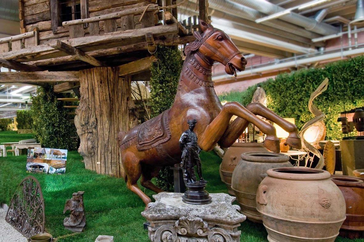 Proposte curiose ma, naturalmente, anche proposte molto più classiche: da una preziosissima vera da pozzo veneziana del Quattrocento, a diversi, importanti esempi di statuaria da giardino, a camini, tavoli e arredi marmorei, a una spettacolare sequenza di cancellate storiche, a fontane, panchine d’epoca, soprattutto inglesi e francesi, ma anche colonne, pinnacoli, obelischi, sfere e altri arredi marmorei di provenienza soprattutto estera. Poi, in esposizione, tutto quello che serve per la ristrutturazione di un casale di campagna, dal pavimento in legno alle porte antiche, dalle ceramiche antiche a pezzi contemporanei creati da laboratori specializzati per ricreare l’atmosfera, dove purtroppo si è perduta, delle antiche decorazioni murali o pavimentali. In più legni, capriate e travature scolpite e dipinte, infissi d’epoca, porte e grandi portali, vetrate istoriate, campane, bronzi e sculture da giardino d’lnverno etc…….