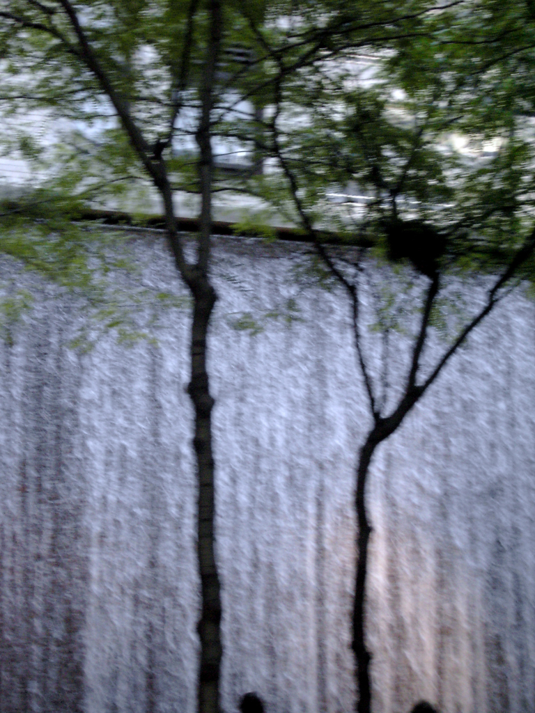 Lungo la strada il parco si segnala per il posizionamento di alberi e per la presenza di fiori dai colori brillanti. Per entrare si devono fare 4 gradini. L’entrata è sul lato più corto ed è più stretta dello stesso. Si entra nel piccolo parco come in una scatola rettangolare, avendo di fronte, come sfondo, un muro di acqua (alto 20 piedi) che riversa 1800 galloni (quasi 7000 litri) al minuto: un sipario di acqua che con il proprio rumore copre il rumore della città circostante ed attira irresistibilmente lo sguardo su di sé.