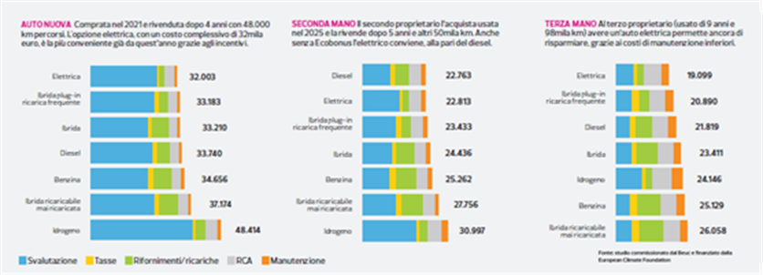 Per andare a individuare il costo complessivo di ogni tipo di veicolo sono state analizzate diverse voci: la svalutazione nel tempo (incentivi inclusi), l’iva, i rifornimenti di carburante o ricariche di elettricità, le tasse, i costi di assicurazione e di manutenzione ordinaria. Tenendo conto di questi criteri, l’auto elettrica si piazza al primo posto in termini di convenienza e si stima che lo