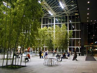 L’atrio nella sua forma attuale, ha una forma triangolare. Alto più di 20 metri, è totalmente ricoperto di vetro su una struttura tubolare bianca, le pareti anch’esse di vetro, verso la 56.a strada e parte della Madison Avenue, permettono il passaggio della luce che inonda le piante di bamboo e il pavimento in granito chiaro rende l’interno chiarissimo. La pur presente e incombente Manhattan sembra lontana.