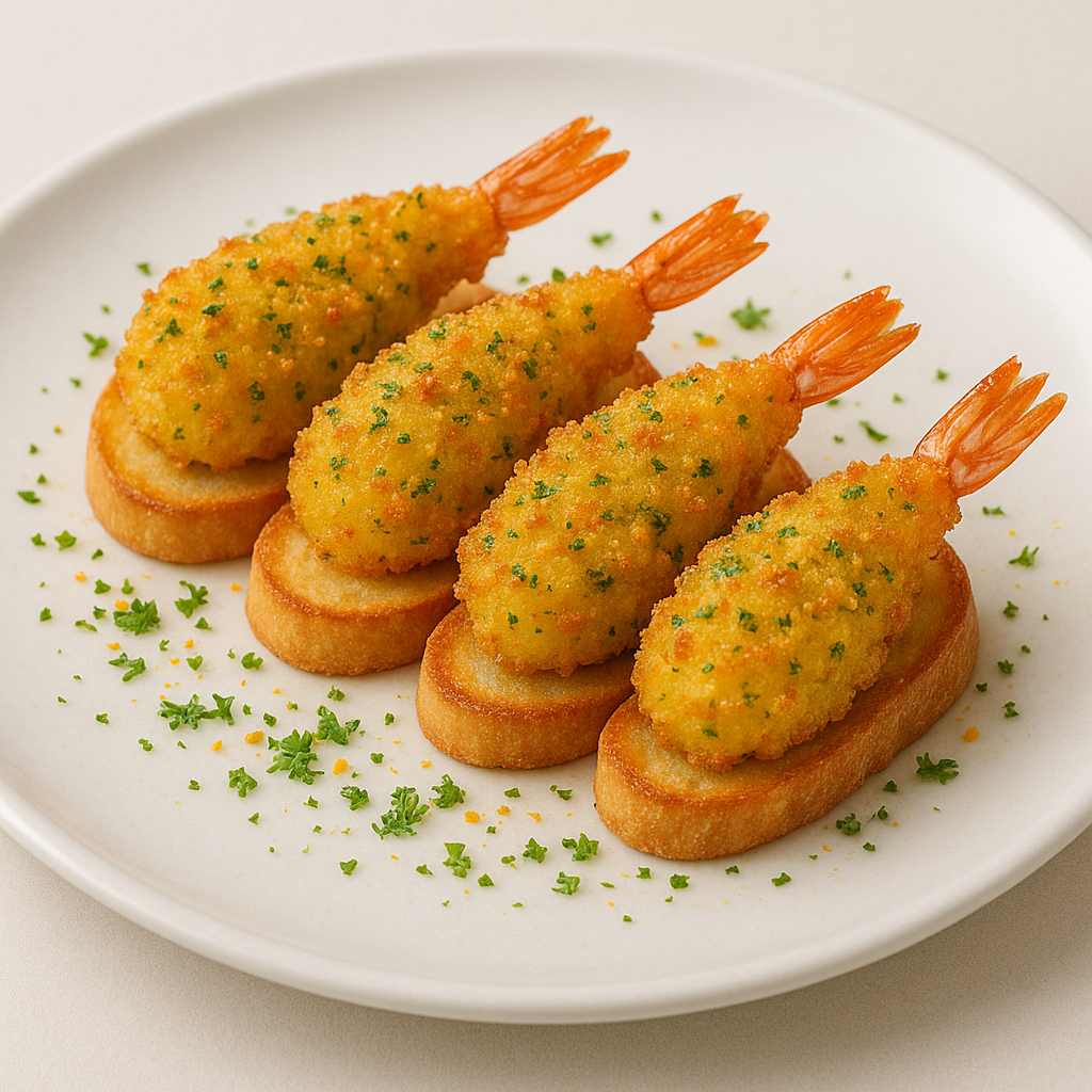 Per la base: tagliate tutti uguali 20 fettine di pane francese- Tostatele quindi tenetele al caldo- Passate al tritatutto elettrico le fette di pancarrè con un pezzetto di buccia d’arancia e le foglie di un mazzetto di prezzemolo (panure) – Passate le code di scampo nella panure, facendola aderire bene- Friggetele poi in poco olio bollente, togliendole appena saranno dorate e croccanti- Salatele- Pepatele, quindi appoggiatele sui crostini di pane ben caldi e servite