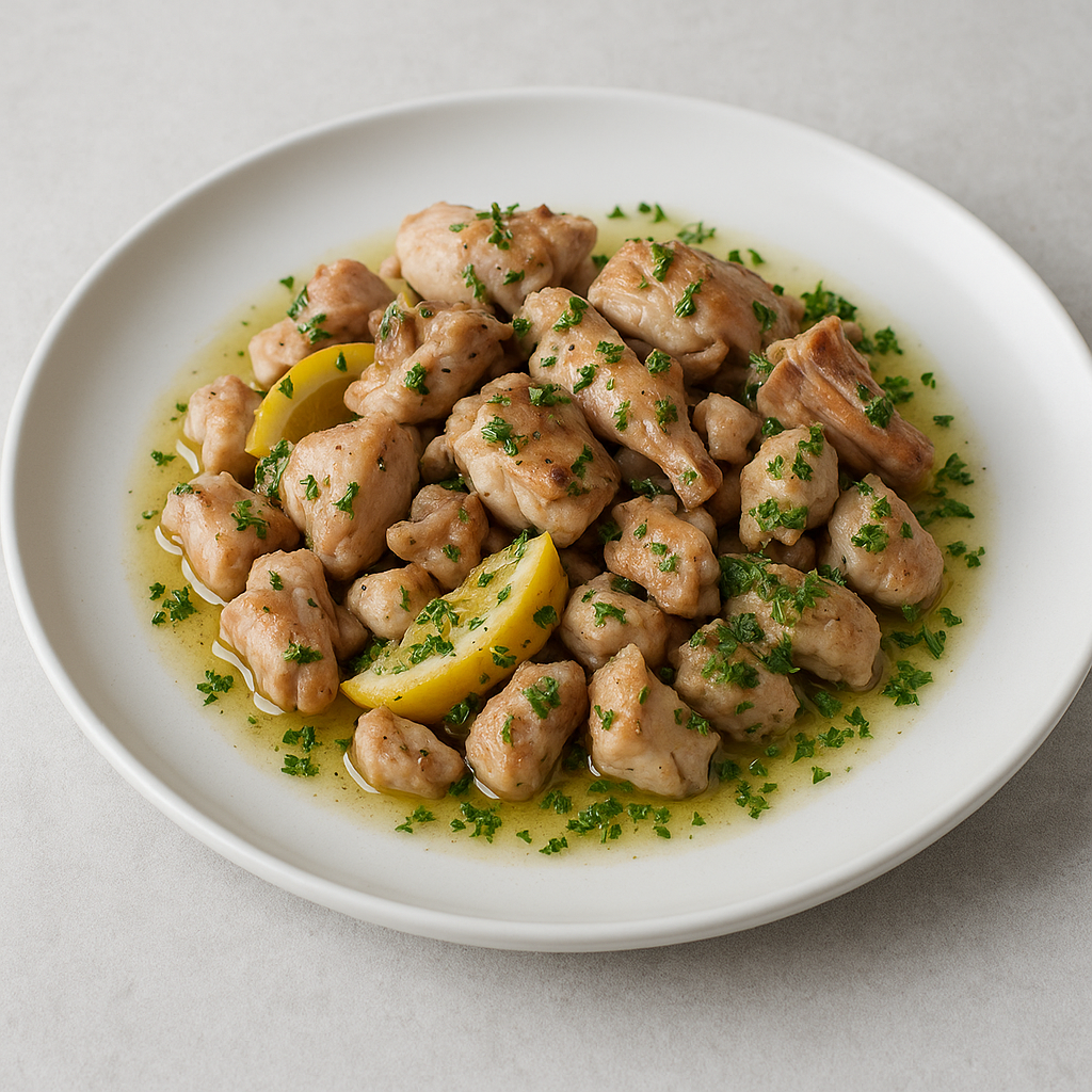 Un piatto costruito su un equilibrio acido-proteico: pollo e coniglio, tagliati in bocconi regolari, vengono sottoposti a una marinatura al limone che ne modifica in modo controllato la fibra. La cottura in forno a temperatura costante permette una uniforme coagulazione delle carni, mentre gli oli essenziali degli agrumi apportano freschezza senza sovrastare. La deglassatura con vino bianco produce una salsa corta e pulita, utile a legare il piatto senza appesantirlo. La finitura con timo, rosmarino e maggiorana introduce una chiara identità aromatica, mantenendo la preparazione lineare e leggibile
