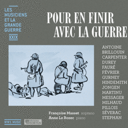 E, finalmente, l’angoscia delle famiglie e il lutto delle vedove attraverso le voci – spesso inedite – dei poeti e dei compositori riunite nel n°29, Pour en finir avec la guerre, una retrospettiva e un bilancio dei terribili anni del conflitto. Ed una testimonianza, un ricordo carico di tenerezza dei due interpreti, il soprano Françoise Masset e la brava pianista Anne le Bozec che abbiamo già apprezzato in altri cd della collezione.