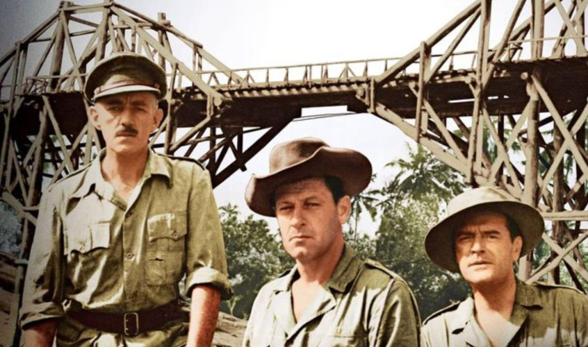 La prima pellicola, basata sul libro di Pierre Boulle edito nel ‘52 ex prigioniero nel conflitto indocinese, racconta in modo romanzato un episodio della costruzione della Burma Railway nel 1943 sul fiume Mekong dove morirono circa 13 000 prigionieri. In realtà furono edificati due ponti in uso per un paio di anni, uno in legno provvisorio e uno in ferro semidistrutto dai bombardamenti alleati ma poi riparato (e oggi rinomata attrazione turistica). Comparato alle sequenze adrenaliniche attuali, il film con le sue quasi 3 ore di girato, ha cali di tensione e tradisce il gusto dell’epoca ma fa piacere ogni tanto immergersi nei campi lunghi, nelle sequenze diluite, nei colori sfumati, nella sceneggiatura ragionata. Il regista inglese David Lean, autore di colossal quali “Lawrence d’Arabia”, “Il dottor Zivago”, annovera, con il contributo della musica (la celebre marcia fischiettata diventa un cult) numeri da record per quei tempi: ricostruisce a Ceylon per 9 mesi un gigante di legno che nella sequenza finale salta in aria in 40 secondi, riceve 8 premi Oscar, tra cui miglior attore per sir Alec Guinness. L’attore inglese, qui nel suo ruolo più iconico, è l’integerrimo colonnello Nicholson a capo di una guarnigione inglese arresasi al Giappone, confinata in un campo di lavoro in Birmania, a cui viene imposto di costruire il ponte per la ferrovia sopra il fiume Kwai. Il suo alter ego è Shears, un anonimo marinaio Usa che si finge comandante, impersonato da un magnifico William Holden, che morirà nel tentativo di portare a termine la distruzione dell’opera; per molta parte di critica – in specie quella americana – è considerato il vero protagonista morale. Nicholson è l’emblema del fanatismo e della vanità ammantata di legge militare e dell’inglesissimo senso di superiorità morale sui barbari, (“Quando questa guerra finirà si saprà che questo è stato fatto non da schiavi ma da soldati inglesi”); il suo rigore sfocia nella emblematica scena finale in cui colpito da fuoco amico per aver cercato di impedire il sabotaggio muore cadendo sulla leva che farà detonare il ponte. Riecheggiano le parole del medico che assiste alla scena: “Follia, follia”, molto simili all’orrore di “Apocalips now”.