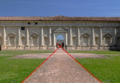 Dalla seconda fotografia si nota che i bordi del viale convergono in un punto, il “punto di fuga”, che il Romano ha fatto coincidere con due archi, l’ultimo dei quali è l’arco centrale del Emiciclo dell’Esedra che si apre alla città.