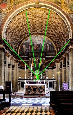 Come si può notare dalle linee verdi nella seconda fotografia le linee dell’abside convergono su un punto, il tabernacolo: scelta non casuale.