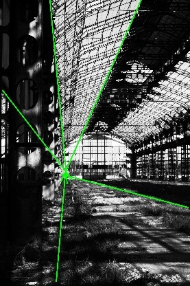 Stiamo sulla seconda immagine: tutte le linee convergono su un punto indicato dall’incontro delle linee verdi. Fino a qui niente di nuovo: è il punto di fuga. Il fotografo, per dare maggiore enfasi a questo punto di fuga – un fenomeno “naturale”, la convergenza – ha utilizzato anche una tecnica di composizione ben nota, la c.d. “regola dei terzi”.