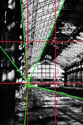 Ma fotografare richiede normalmente tempi più brevi che dipingere: la “sezione aurea” è stata quindi approssimata nella “regola dei terzi”. Tutte le righe hanno pari dimensioni tra loro e tutte le colonne hanno pari dimensioni tra loro.Con la suddivisione orizzontale e verticale dell’immagine in tre secondo la “regola dei terzi” – tramite le linee rosse nella terza immagine della fabbrica dismessa – si ottengono quattro punti centrali – dati dalla la loro intersezione.Le linee di divisione sono dette “linee di forza”: quelle orizzontali vengono utilizzate per posizionare l’orizzonte e i piani di prospettiva.