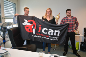 (From L) Nuclear disarmament group ICAN coordinator Daniel Hogstan, executive director Beatrice Fihn and her husband Will Fihn Ramsay pose with a banner bearing the group's logo after ICAN won the Nobel Peace Prize for its decade-long campaign to rid the world of the atomic bomb as nuclear-fuelled crises swirl over North Korea and Iran, on October 6, 2017 in Geneva.
