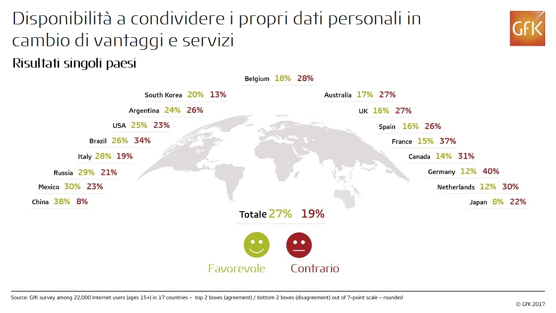 Le risposte degli italiani si collocano leggermente al di sopra della media internazionale: il 28% degli intervistati ha infatti dichiarato di essere disposto a comunicare i propri dati in cambio di benefici di qualche sorta.