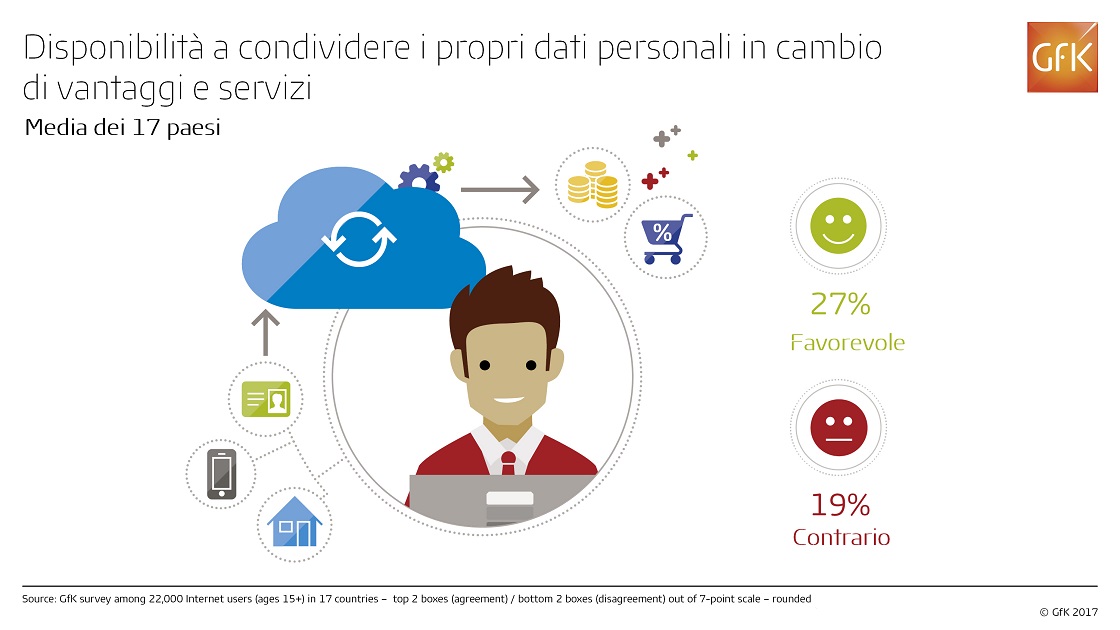 Sareste disposti a condividere i vostri dati personali in cambio di un vantaggio immediato? È quello che ha chiesto GfK ad un campione internazionale di oltre 22.000 persone. Ne è emerso che la percentuale di persone disposte a comunicare i propri dati in cambio di qualcosa è superiore a quella delle persone totalmente contrarie. In Italia quasi una persona su tre si dichiara favorevole. A livello internazionale, i trentenni e i cittadini di Cina, Messico e Russia sono i più aperti rispetto a questa possibilità.