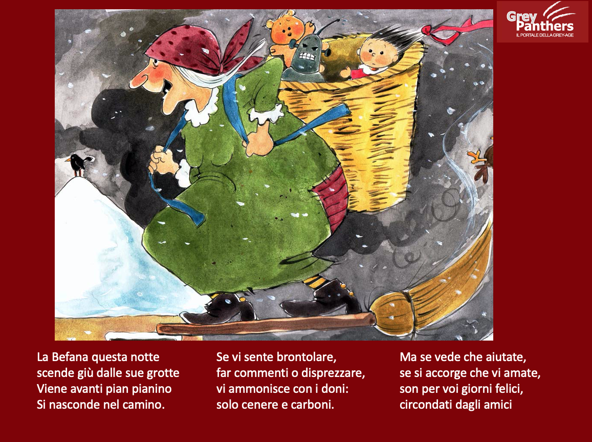Ultima delle cartoline di Grey Panthers per le feste di fine anno 2022-2023. Affidiamo anche alla Befana l’augurio da spedire a nipotini e amici. Con tanti buoni pensieri