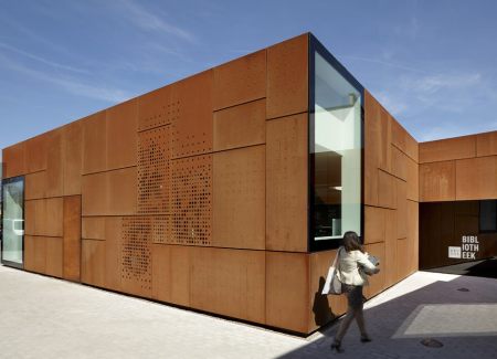 Nel 2012, lo Studio Farris Architects ha vinto il concorso organizzato dalla città di Bruges per la ristrutturazione e l’ampliamento della biblioteca della città di Sint-Andries. Il tessuto su cui la biblioteca ha potuto espandersi era molto limitato quanto a dimensioni e si trova in un ambiente urbano. La libreria esistente, di colore bianco, al fianco di altri servizi pubblici, era situata in un edificio considerato patrimonio architettonico. Le facciate dell’ampliamento sono rivestite in pannelli in acciaio Corten che contrastano con le facciate intonacate di bianco dell’edificio principale. La posizione dell’estensione sottolinea la tensione tra l’edificio patrimonio urbano esistente e il nuovo volume. Ampie finestre si trovano agli angoli del nuovo volume per dare alla libreria la visibilità necessaria e l’interazione con l’ambiente circostante. Le aree di lavoro e il personale della reception si trovano vicino a queste grandi finestre quindi dispongono di luce naturale.Per creare una piacevole atmosfera nella libreria, sono stati utilizzati 3 tipi diversi di finestre, consentendo ai visitatori di godere di luce naturale durante tutto il giorno e nelle diverse stagioni.