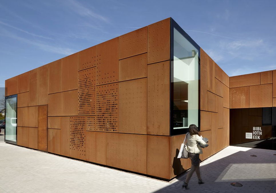 Nel 2012, lo Studio Farris Architects ha vinto il concorso organizzato dalla città di Bruges per la ristrutturazione e l’ampliamento della biblioteca della città di Sint-Andries. Il tessuto su cui la biblioteca ha potuto espandersi era molto limitato quanto a dimensioni e si trova in un ambiente urbano. La libreria esistente, di colore bianco, al fianco di altri servizi pubblici, era situata in un edificio considerato patrimonio architettonico. Le facciate dell’ampliamento sono rivestite in pannelli in acciaio Corten che contrastano con le facciate intonacate di bianco dell’edificio principale. La posizione dell’estensione sottolinea la tensione tra l’edificio patrimonio urbano esistente e il nuovo volume. Ampie finestre si trovano agli angoli del nuovo volume per dare alla libreria la visibilità necessaria e l’interazione con l’ambiente circostante. Le aree di lavoro e il personale della reception si trovano vicino a queste grandi finestre quindi dispongono di luce naturale.Per creare una piacevole atmosfera nella libreria, sono stati utilizzati 3 tipi diversi di finestre, consentendo ai visitatori di godere di luce naturale durante tutto il giorno e nelle diverse stagioni.