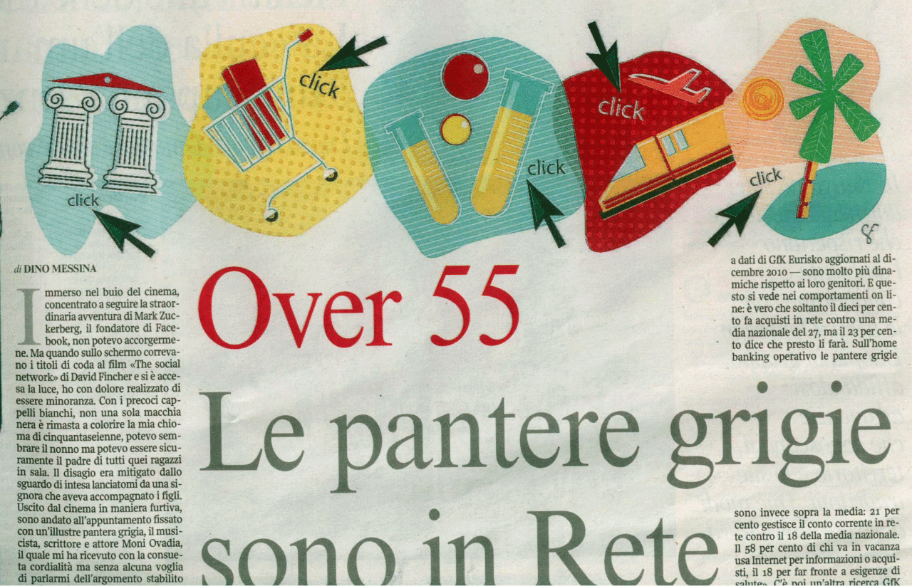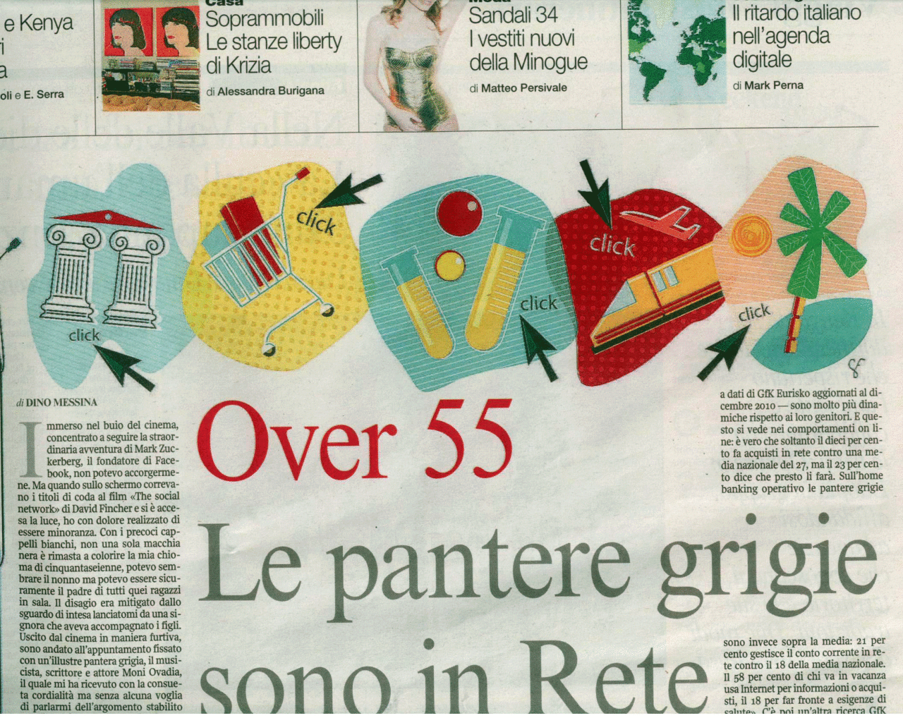 Cari amici, non perdete il Corriere della Sera di oggi! A pagina 31 un interessante articolo a firma di Dino Messina, brillante giornalista della redazione di Milano, che affronta un tema a noi caro: il rapporto tra Senior e Internet. Domani vi daremo il pdf dell’articolo, ma, se la curiosità vi stimola, passate oggi stesso in edicola… è anche una bella giornata!