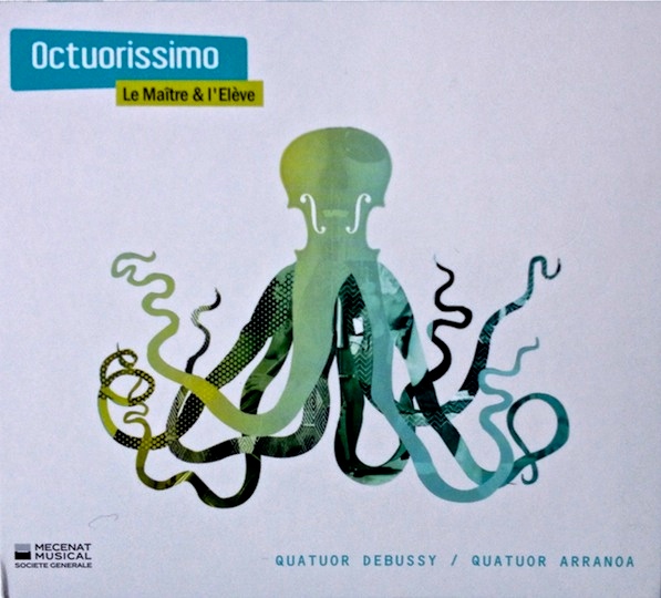 Quinta pubblicazione per «Maître & Elève», Octuorissimo riunisce i quattro virtuosi del Quartetto Debussy – uno dei più interessanti complessi francesi di musica da camera – alle quattro ragazze del Quartetto Arranoa, creato nel 2009 e già laureato di alcuni premi ed ospite di molti festivals (sua principale intenzione è la democratizzazione della musica, per cui le sue esibizioni, oltre che nella sale da concerto e nei teatri, si svolgono nelle scuole, gallerie d’arte e centri culturali, e – spesso – in luoghi più accessibili e popolari come i caffè).
