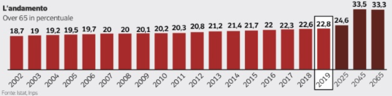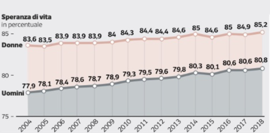 L’ultima certificazione è della Società di gerontologia e geriatria: si è ufficialmente anziani non prima dei 75 anni. Anche perché nel giro di pochi decenni abbiamo guadagnato un bel po’ di terreno sul piano delle aspettative di vita. Negli anni Novanta ci si aspettava di arrivare mediamente a 63 anni, adesso l’attesa è di 83 “ma di questi venti in più solo la metà sono anni di vita sani, senza limitazioni funzionali” per riassumerla con il geriatra Carlo Vergani, uno dei più grandi studiosi dei processi biologici dell’invecchiamento. Tanto per dare un’idea: i dati Istat ci dicono che nel 2045 gli over 65 saranno più di 20 milioni (oltre il 30% della popolazione) e gli under 25 meno di 14 milioni. Già oggi le cose stanno così: per ogni 100 ragazzi sotto i 15 anni ci sono 168 uomini e donne oltre i 65. E ancora: il 7% della popolazione (più di 4 milioni) oggi ha oltre 80 anni e, a giudicare dalla pensione che intasca, non è raro che sia costretto a rinunciare a cure e visite mediche. È sempre dell’Istat il dato sulle pensioni medie mensili: al Nord si arriva a 1.018 euro, nell’Italia centrale la cifra scende a 908 mentre al Sud si ferma a 709. Tutto questo indica un elenco infinito di interventi possibili di tipo economico, previdenziale, sociale, ma più di tutto indica l’urgenza di modificare l’assistenza sanitaria. Partendo da un numero: l’80% degli anziani oltre i 75 anni ha a che fare con almeno una patologia cronica legata al decadimento fisico.