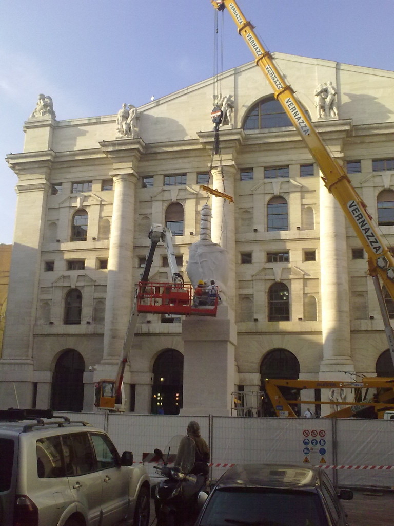 Cattelan ha capito questo, e la sua intelligenza è stata proprio quella di progettare solennità e altezza e di usare la medesima pietra della facciata della Borsa, integrando così il basamento nella stessa architettura del Palazzo, dando dignità e lunga durata al significato simbolico della mano. E dando una lezione a una città, quasi ovunque incapace di offrire un supporto degno alle sue ultime, modeste statue, incapace di comprendere l’importanza e l’obbligo di spendere qualche soldo in più per quella necessaria “architettura” di sostegno che integra l’opera statuaria. Sempre e solo goffi rialzi di terreno ospitano pessimi manufatti a cui viene negata la dignità di un sostegno progettato.