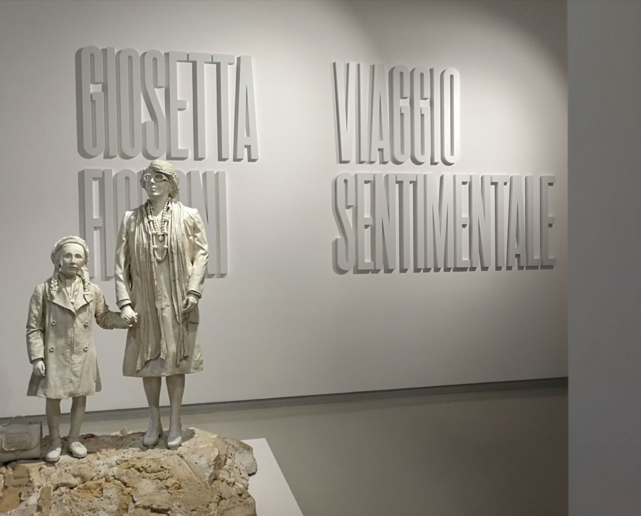 In effetti il titolo della mostra prende spunto dalla vecchia canzone “Sentimental Journey” portata al successo dall’attrice Doris Day negli anni Quaranta, e mette in luce la volontà dei curatori di raccontare tutto quello che è legato alla vita sentimentale dell’artista e trapela dalle sue opere. In oltre sessant’anni di attività Giosetta Fioroni ha sviluppato un linguaggio eloquente, muovendosi a suo agio tra la pittura, il disegno, i video e le proiezioni sulla tela di immagini riprese dalla realtà, dai libri, dalle riviste che poi dipingeva con il colore argento o rosso, sottolineandone le forme e i contorni. Le immagini della memoria diventano così apparizioni, figure immerse in un fondo più chiaro, frammenti di oggetti e di paesaggi. A volte, specie negli ultimi anni, ha usato anche la ceramica e ha realizzato vere sculture colorate, fra cui busti di donne, teatrini e presepi. Una particolare scultura in resina del 2002 la ritrae bambina con lunghe trecce e il paltò, tenuta per mano da una Giosetta adulta. (Il titolo dell’opera è “Giosetta con Giosetta a nove anni”). Giovinezza e maturità si tengono per mano e sembrano camminare insieme, lungo un percorso segnato dai ricordi. Quasi a indicarci che gli affetti vissuti sono un patrimonio che non si perde mai, fa parte di noi, e si arricchisce con gli anni.