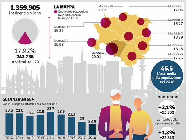 Una città di anziani e di single. La Milano del 2030 avrà un milione e mezzo di abitanti, metà dei quali vivrà però da solo e uno su cinque avrà più di 70 anni d’età. È il documento sul piano welfare dei prossimi anni approvato in giunta in questi giorni che fotografa la città che verrà. I dati del sistema informativo raccontano di un lieve aumento della fascia 35- 54 anni (più 2,1 per cento) e di quella tra i 55 e i 70 (più 1,3 per cento). Entro il 2035 gli over 70 passeranno invece da 243mila a 263mila e andranno a sfiorare il 20 per cento della popolazione complessiva.