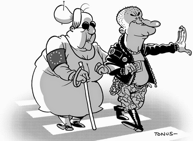 L’idea viene dal risultato delle elezioni europee del maggio scorso, che hanno segnato l’avanzata delle estreme destre e degli antieuropeisti: non propriamente la vittoria dei boy scout. Nella vignetta si vede una anziana Europa cieca, accompagnata ad attraversare le strisce da un naziskin. Nessun giudizio, se non la rappresentazione di quello che è, senza troppi fronzoli.
