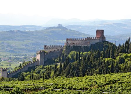 Ad esserci stati sono forse in pochi, ma a conoscerla sono davvero in parecchi: tutti quanti abbiano mai transitato sull’autostrada A4 Torino-Milano-Venezia nel tratto tra Verona est e Vicenza, all’altezza del casello di Soave-San Bonifacio. Anche all’occhio più distratto non può sfuggire la scenografia del castello scaligero arroccato sopra una collina, con le forti mura merlate che scendono a contenere la città medioevale sottostante, come una Madonna con le braccia protese a proteggere il suo popolo. E tutto intorno, vigneti a perdita d’occhio, come se qui le persone vivessero soltanto di vino, il che in un certo senso è vero. A Soave, famosa per il suo bianco omonimo, l’epiteto di città del vino calza proprio a pennello: siamo infatti di fronte al più esteso vigneto contiguo d’Europa, 6.000 ettari di viti e un numero imprecisato di cantine sociali e private, la più antica ancora in attività risalente al 1901. Il che, con 500 mila ettolitri, rappresenta il 40 % dei tutta la produzione vinicola DOC della provincia di Verona, il 60 % delle DOC venete e il 14 % di quelle italiane. Senza contare che questo territorio confina con altri due importanti comprensori vitivinicoli, il Bardolino e il Valpolicella. Insomma a chi piace bere, e bere bene, qui si trova nel posto giusto. Un paesaggio tanto piacevole da spingere recentemente il Ministero dell’Agricoltura ad assegnare a Soave il riconoscimento di “Paesaggio storico rurale d’Italia”, titolo accordato finora soltanto ai comprensori vinicoli veneti di Conegliano e di Valdobbiadene. La sua fortuna, climatica e pedologica, è di trovarsi alla confluenza in pianura di tre vallate pedemontane provenienti dai monti Lessini – val d’Illasi, val Tramigna e val d’Alpone – che convogliano acqua ed un terreno alluvionale composto da fertili rocce vulcaniche e calcaree ricche di minerali. Qui, in vigneti che arrivano fino ai 500 m di altitudine e che ricamano il terreno come fossero le trame di un gigantesco telaio, si producono i vini Soave classico, il Lessini Durello spumante, il Valpolicella e l’Amarone rossi, tutti DOP, e il Recioto passito DOCG, prodotti da uve Rondinella, Corvina, Corvinone, Garganega Trebbiano e Durello, tutti vini con un buon equilibrio tra le componenti acide, zuccherine e scipide, senza che nessuna prevalga sulle altre, con un corredo aromatico dove spiccano i sentori floreali di sambuco e quelli fruttati di pesca e albicocca. Il territorio può anche essere esplorato percorrendo la Strada del Vino Soave, un percorso di 80 km su tre diversi itinerari che oltre al vino (vigneti, cantine ed enoteche), tocca anche località di interesse turistico e artistico, nonché produttori di olio, salumi e formaggi, ristoranti e agriturismi.