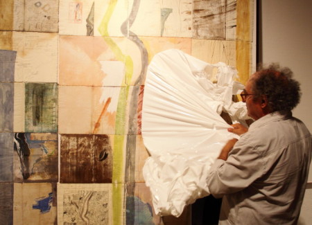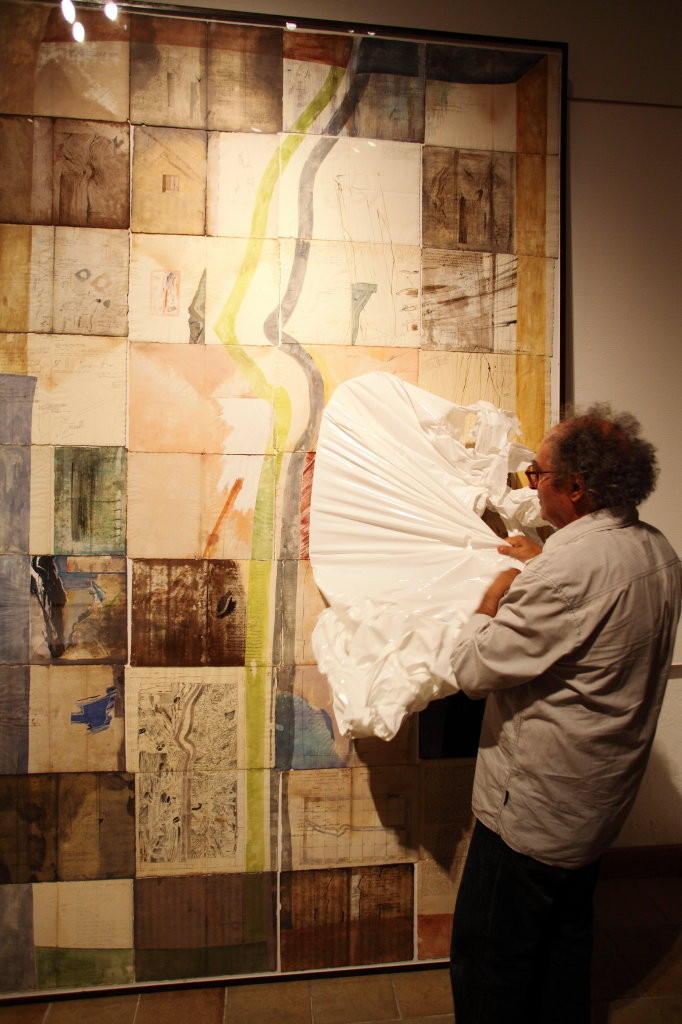 La mostra comprende opere relative a un ampio arco temporale, da quelle realizzate nell’ambito della prestigiosa committenza per il Cenacolo francescano di Gerusalemme nel 2013/15 fino al ciclo delle vetrate realizzate per il Duomo normanno di Cefalù (1984-2003), dalle opere scenografiche per Mozart, Wagner, Bellini, Strawinscky, Poulenc etc. a quelle per i compositori contemporanei Bussotti, Henze, Togni, Clementi, etc. realizzate per i più prestigiosi teatri internazionali d’opera.