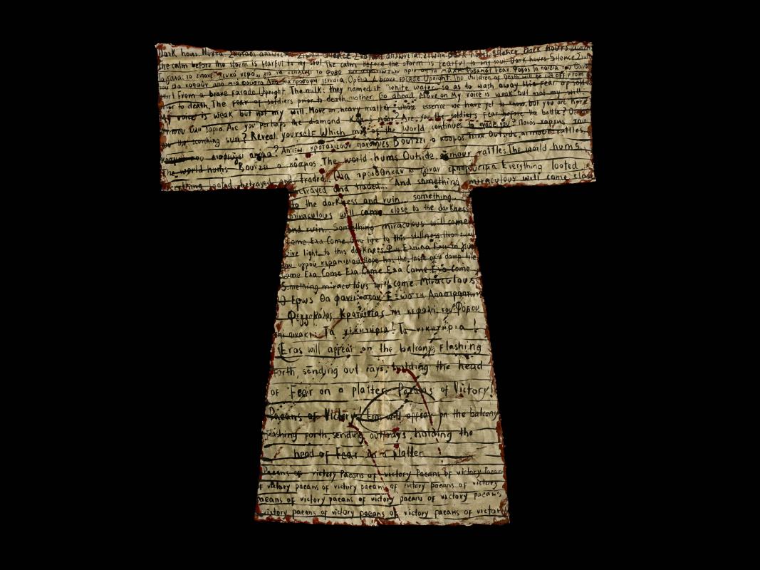 In tutti i lavori esposti al Museo Salinas protagonista è la materia – dalla pietra lavica alla carta a mano cinese, dal bronzo al marmo e al gesso – che sottolinea quanto l’archeologia riviva nella contemporaneità e l’immersione nel passato serva a comprendere il presente. Spiega infatti la scultrice: “A Palermo espongo le pietre vulcaniche, le teste dei guerrieri caduti e degli eroi, così come le opere su carta cinese, le Vesti di Nesso, l’Armatura Segreta e le Linee di pensiero. È un dialogo tra fragilità e solidità, l’effimero e l’eterno. Una riflessione sul modo in cui l’archeologia svela la materia nel presente. La materia, quindi, è il tema principale”. Venia Dimitrakopoulou decide di “sentire” attentamente ciascun luogo del suo lungo tour espositivo, creando appositamente nuove opere per rimanere “sintonizzata” con l’atto creativo, così come lei lo concepisce: “un processo continuo, un flusso in cui tutto è aperto all’inaspettato”. E così, per citare alcuni lavori esposti al Museo archeologico di Palermo, gessi, bronzi e pietre vulcaniche di Egina (isola dove ha sede lo studio dell’artista) diventano teste e volti, spesso dalla bocca semi aperta, di antichi guerrieri, eroi e semidei come nelle opere Agamennone (2005-2009) e Pelope (2009), accanto a Lance (2018) in marmo e ottone dorato che raccontano.Tutte le opere della Dimitrakopoulou hanno un profondo carattere antropocentrico e riflettono sul ruolo dell’esistenza umana nello spazio e nel tempo che l’artista sceglie di cogliere nella sua creazione, chiamando l’osservatore a partecipare dell’espressione artistica, a viverla come una relazione con se stesso, attraverso un’esperienza interiore, mentale e sentimentale. Emblematiche le serie su carta delle Vesti di Nesso e delle Linee di pensiero (entrambe del 2011) dove, attraverso la scrittura automatica sulla forma di un’antica tunica o di uno stendardo, traspare in diverse lingue la dimensione intima dell’artista, che libera i suoi sentimenti e pensieri per poi nasconderli parzialmente dietro ad una linea, quasi a cancellarli ma mai del tutto.