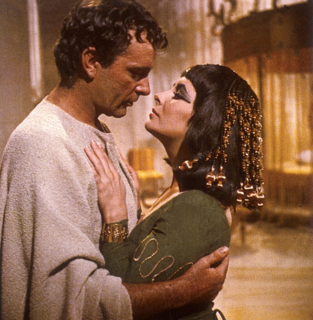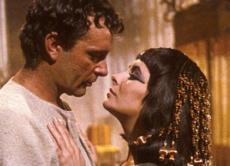 Il 2 gennaio 1962 Liz Taylor scelta per il ruolo di Cleopatra e Richard Burton per quello di Marco Antonio, si incontrano per la prima volta sul set. All’inizio l’incontro tra i due non è dei più passionali, come ricorda Anna Maria Mori su la Repubblica il 6 agosto 1984: “Dice Burton della sua partner nel film: ‘Lei Cleopatra? É ridicolo: somiglia a una fantesca durante l’allattamento. Spiegami dov’è bella questa piccola sfera, questo batuffolo di grasso. La faccina è passabile (se proprio vuoi) ma è scura, troppo scura. Scommetto che si fa la barba ogni mattina…’. Appoggiato a una colonna dorica di cartapesta, la corazza sbottonata sul petto, Antonio – Burton cercava invano di ammazzare con la ventesima sigaretta il terzo bourbon della mattina. Di fronte a lui il povero Giulio Cesare – Harrison, travolto dal monologo, non ribatteva più: in cuor suo sperava solo che quel fiume di oltraggi, tuonanti con tono shakespeariano non arrivassero all’orecchio dell’interessata”.