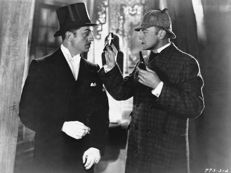 Il primo Holmes di un certo spessore, caratterizzato da una rigorosa mantellina sportiva a quadretti, un cappello da caccia e una pipa Calabash in bocca, è quello interpretato nel 1922 da John Barrymore, intitolato Sherlock Holmes contro Moriarty di Alberto Parker, mentre il primo, che potrà parlare con la sua voce al pubblico delle sale dopo la fine del muto, sarà Clive Brooks protagonista di tre film della serie e da Arthur Wontner interprete di cinque pellicole. Nel 1939 è la volta dell’affilato Basil Rathbone, che in coppia con Nigel Bruce impersona Holmes in ben quattordici film di cui undici diretti da Roy William Neil. I due attori ottengono un successo senza precedenti già a partire da Sherlock Holmes e il mastino dei Baskerville per la regia di Sidney Lanfield. Negli anni Cinquanta i produttori della celebre Hammer (nota casa cinematografica inglese) realizzano, come già avevano fatto con altre serie (Dracula e Frankenstein), La furia dei Baskerville, 1959 di Terence Fisher con l’ottimo Peter Cushing (Holmes) e con André Morell (Waston). Negli anni Settanta i gusti del pubblico sono molto cambiati e il cinema si adegua alla nuova realtà. Il desiderio di mettere in discussione anche personaggi tradizionali come il nostro detective è irresistibile. Nel 1970 Billy Wilder firma forse uno dei suoi film più belli, La vita privata di Sherlock Holmes, interpretato da Robert Stephens nel quale vediamo un Holmes malinconico, fragile, deluso (ipoteticamente omosessuale?), che si innamora di una spia e si batte contro un sommergibile simile al Mostro di Loch Ness. Nel 1975 Gene Wilder dirige e interpreta Il fratello più furbo di Sherlock Holmes, insieme a Marty Feldman, Dom De Luise, Madeline Kahn; una satira davvero divertente di grande successo. Nel 1976 è la volta di Herbert Ross, autore di Sherlock Holmes soluzione settepercento, in cui vediamo il detective recarsi a Vienna nello studio del dottor Freud per liberarsi dalla dipendenza della cocaina, un vizio che nel romanzo serviva per combattere noia e stress.