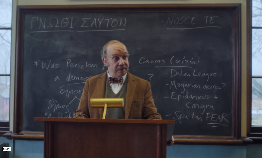 Siamo nel 1970 in un superliceo del New England, ovvero sulla costa atlantica degli States a nord di New York. Il superliceo è una scuola secondaria con iscritti prevalentemente ragazzi dell’alta borghesia destinati ai più prestigiosi college universitari. E la Burton, così si chiama la scuola, è impostata già come un college, proprio per preparare meglio i rampolli al loro futuro di classe dirigente. Siamo anche sotto Natale, ossia negli ultimi giorni di lezione prima delle feste. È questo l’ambiente in cui lavora il prof. Paul Hunham, scorbutico e severo docente di storia antica, terrore degli alunni e anche piuttosto impopolare tra i colleghi.