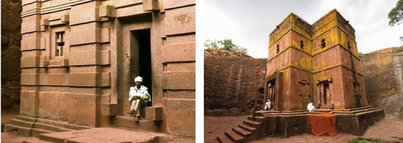 Scavato all’interno, è lavorato esternamente in modo da assumere la forma di tetto, facciata e pareti ed è infine traforato per ottenere porte e finestre: opera finissima che presuppone un progetto assolutamente lucido e originale e denota un vivo senso dell’arte coadiuvato da una manodopera abilissima. All’interno alcune chiese sono decorate con bassorilievi scavati direttamente nella roccia. La chiesa di Bet Giorgis, a forma di croce greca, presenta un tetto sostenuto all’interno da 4 colonne collegate da archi. Le chiese si suddividono in due ‘blocchi’, nord occidentale e sud orientale, distanti tra essi alcune centinaia di metri. Attraverso cunicoli e passaggi scavati nella roccia si peregrina da una chiesa all’altra per ammirare nel suo complesso questo monumento litico religioso unico al mondo. Nel pomeriggio visita di un blocco di chiese, la “Gerusalemme terrena”. Cena e pernottamento al Maribela o al Panoramic View, tra i migliori hotel di Lalibela, con una vista superba sulle valli circostanti.