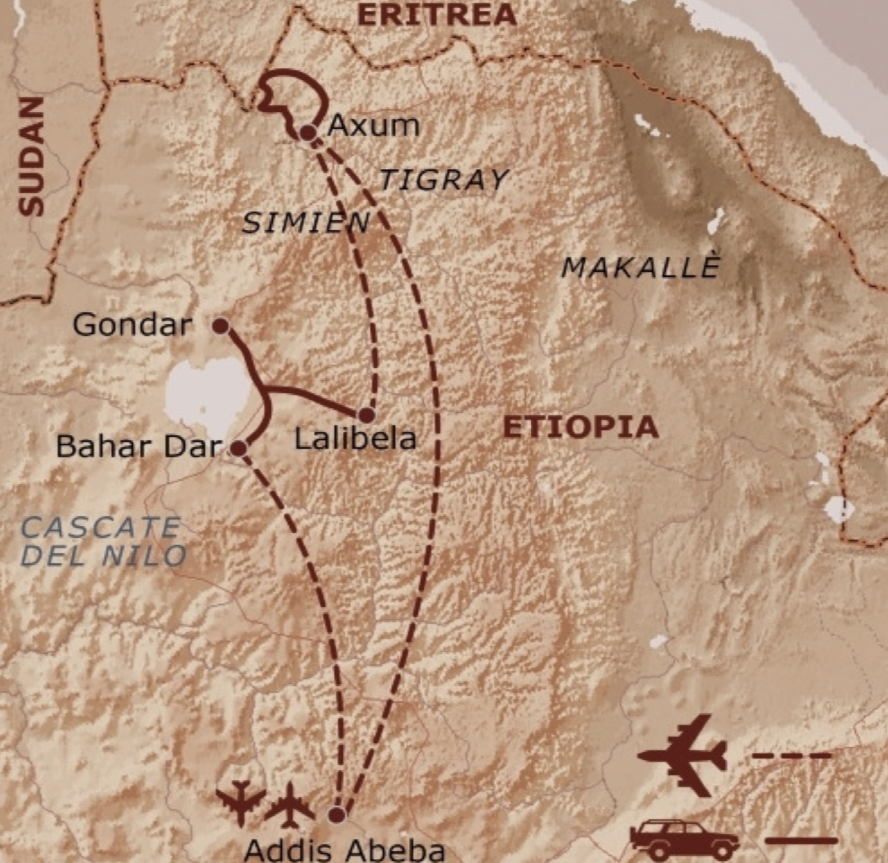 Da Addis Ababa in volo ad Axum (UNESCO), famosa per il Parco delle Steli e dove la leggenda vuole che in una delle chiese sia nascosta l’Arca dell’Alleanza; poi in volo a Lalibela (UNESCO), isolato villaggio nascosto tra le montagne che custodisce le straordinarie chiese monolitiche, scavate nella roccia, narrano le leggende, in una sola notte.