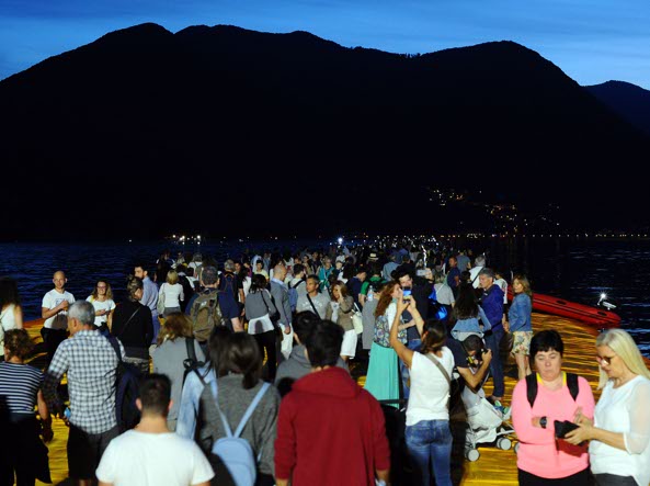 La circolazione ferroviaria nel Bresciano è andata in tilt. Il Comune di Montisola non riesce a garantire la pulizia del paese e le strutture del Floating Piers hanno bisogno di manutenzione, per reggere fino alla fine. Così è certo l’addio alle passeggiate notturne. L’ordine di chiusura è arrivato dal prefetto di Brescia: la passerella di Christo sarà chiusa da mezzanotte alle sei del mattino, ogni giorno, fino al 3 luglio. Il miracolo, vista la bolgia umana (270 mila visitatori in quattro giorni), è che sia ancora aperta. Il messaggio ha scatenato la psicosi da grande evento: mercoledì sera si registravano ore di coda all’ingresso della passerella per l’ultima apertura notturna. Un vero e proprio assalto, e se tanti hanno rinunciato a causa della lunga attesa, la folla ha continuato ad arrivare a Sulzano a ritmo sostenuto per tutta la notte.