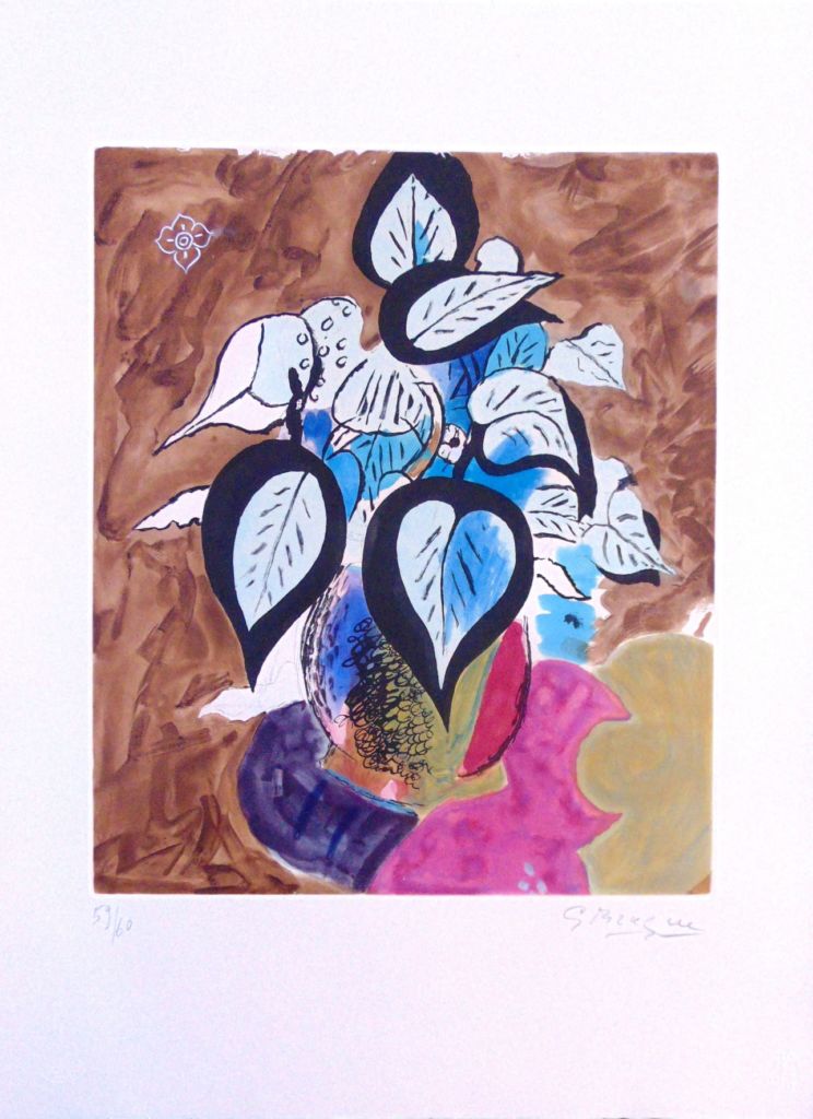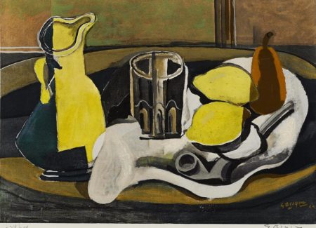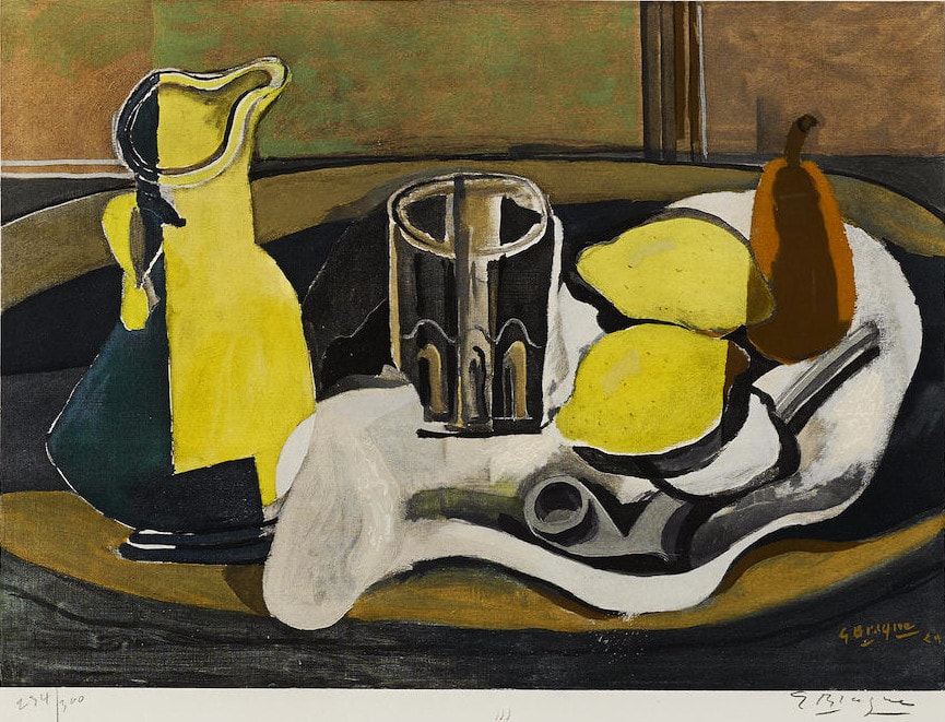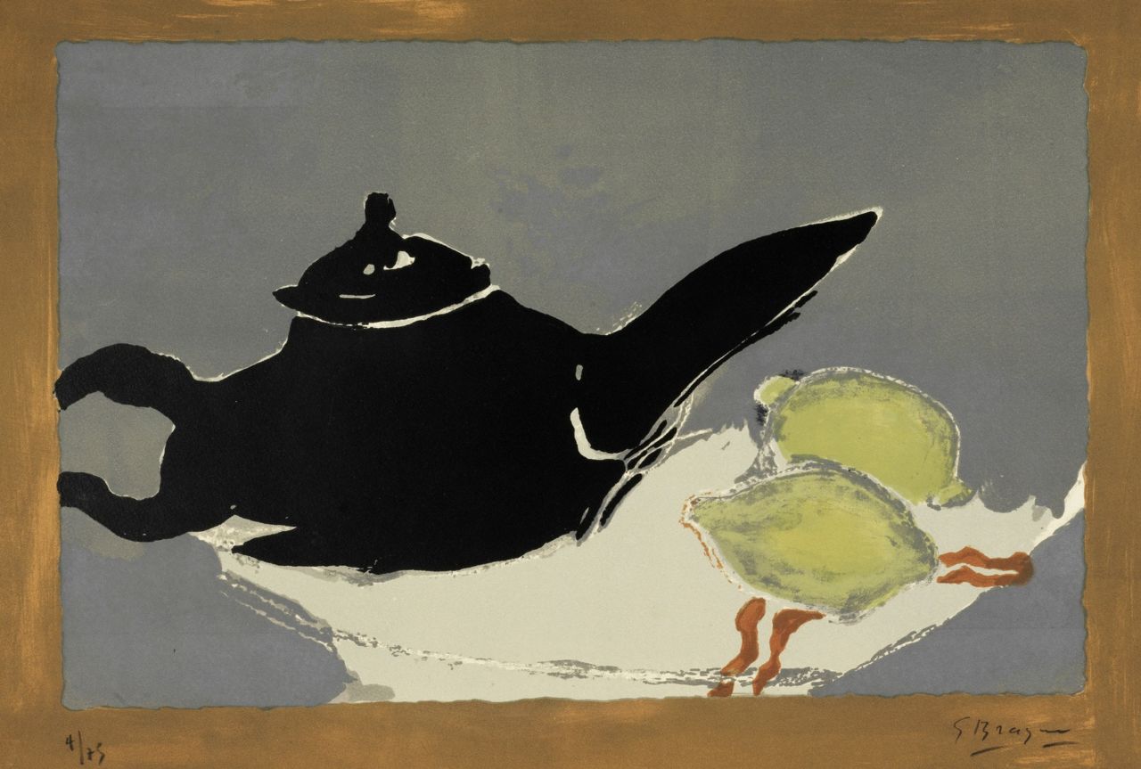 La produzione grafica di Braque ha inizio nel Novecento, negli anni 1907 e 1908, con incisioni di matrice cubista principalmente rivolte agli oggetti del quotidiano, che diventano negli anni sempre di maggior impatto visivo grazie alla componente cromatica, soprattutto nei lavori datati fra la fine degli anni ‘40 e gli anni ‘60. In mostrale oltre 30 importanti opere grafiche originali consentono di ammirare la potenza dell’evoluzione artistica e la peculiarità creativa del capostipite del Cubismo. I capolavori esposti sono di grande interesse e fortemente caratteristici per sintesi, poesia e per il legame con la realtà come si osserva nella litografia Théière grise(1947) e nelle preziose incisioniNature morte aux huitres(1950) e Nature morte aux citrons (1960); tutte opere in cui è ricorrente la natura morta, tema molto caro all’artista francese. È proprio nel secondo dopoguerra che Braque si riaccosta a un’interpretazione della natura più