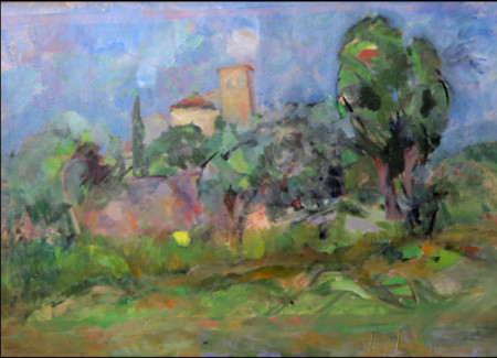 I quadri raccolti nella Galleria Civica “Gian Battista Bosio”, che già mi accolse nel 2006, sono il bottino degli ultimi anni di lavoro. Sempre partendo da Desenzano, guidata dal paziente Mario, a cerchi sempre più ampi, abbiamo invaso campi, salito colline, esplorato boscaglie, scoperto fattorie antiche, muretti intercalati da cappellette, strade sterrate rese bianche dal riverbero del sole e chiesette di campagna “ch’erbose hanno le soglie”. Vado alla ricerca dell’anima, del nocciolo, dell’essenza della natura con partecipazione inventiva per liberare i paesaggi dalle lusinghe dell’esuberanza. Ho sempre più amato questa terra fraterna. Il mio sentimento nostalgico non deve darmi l’etichetta di pittrice sognante. A Milano ho seguito un corso specifico. Il diploma che mi dichiara “Imprenditrice agricola” mi serve come supportoper recuperare lo spettacolo essenziale della natura. Un ritorno al sogno de La buona terra, del Ritorno al paese, del Grano non muore, libri scritti da poeti, pittori e scrittori che hanno equilibrato la poesia magica della natura con nozioni scientifiche, che hanno ricaricato il paesaggio di mille riverberi.