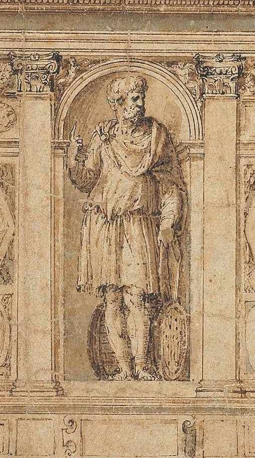 Progetto per un banco con nicchie contenenti figure di personaggi antichi (da sinistra a destra: un giovane non identificato, Marco Attilio Regolo, Ercole, Lucio Giunio Bruto e forse Giulio Cesare).