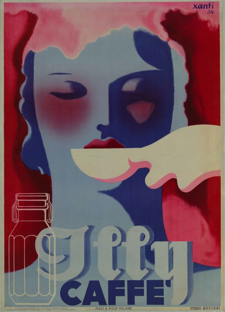 La figura umana viene ancora interpretata in chiave di modernità per impersonare le continue novità dell’industria: l’uomo Fiat di Nizzoli o il meccanismo antropomorfo dello Sniafiocco di Araca (Enzo Forlivesi), per esempio. Anche il volto umano diventa spesso soggetto di affiche, scomposto in chiave quasi cubista, geometrizzato o reso quasi un sogno, come nel manifesto per Illy Caffè di Xanti). A proporre una visione onirica e irrazionale, libera da suggestioni logiche. E la grafica si dimostra già pronta a voltare pagina”.