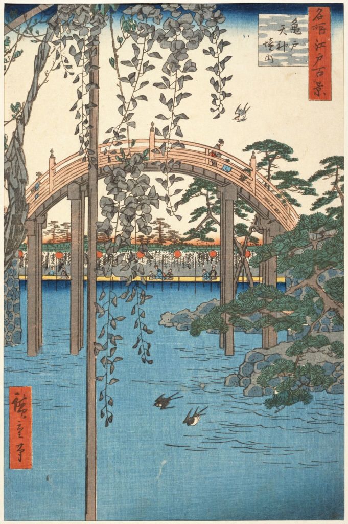 Neve, pioggia, chiarori di luna e nebbia sono elementi che Hiroshige sa far percepire in modo quasi tattile e la varietà di tipologie di pioggia per ogni stagione che riesce a rappresentare nelle sue centinaia di silografie policrome del Mondo Fluttuante, gli vale il titolo di “maestro della pioggia”. Immagini molto conosciute nella cultura dell’epoca, rappresentano una fonte di conoscenza del territorio e sono un contributo importante per la costruzione dell’immaginario collettivo, al fine di rafforzare il senso di appartenenza e di legame nazionale. Hiroshige, sempre alla ricerca di un punto di vista alternativo che esalti la bellezza dei luoghi e la vivacità delle attività umane, inizia a lavorare con il formato orizzontale, che porta alla massima espressione nel trittico ma anche nella serie completa delle “Cinquantatre stazioni di posta del Tōkaidō”, conosciuta come Hōeidō dal nome dell’editore che lancia l’artista verso il successo. In seguito Hiroshige sperimenta anche la forma rotonda del ventaglio rigido ed infine, negli anni cinquanta, approda al formato verticale, che segna un cambio epocale nel filone classico del paesaggio. Sfruttando l’asimmetria della composizione, in un equilibrio di pieni e vuoti che si controbilanciano nello spazio del foglio, Hiroshige mette un elemento in primissimo piano, gigante, come in una sorta di close‐up fotografico, lasciando tutti gli altri elementi del paesaggio sullo sfondo e in dimensioni molto ridotte. Questa novità stilistica è ben visibile in mostra in particolare nel suo capolavoro finale “Cento vedute di luoghi celebri di Edo”.