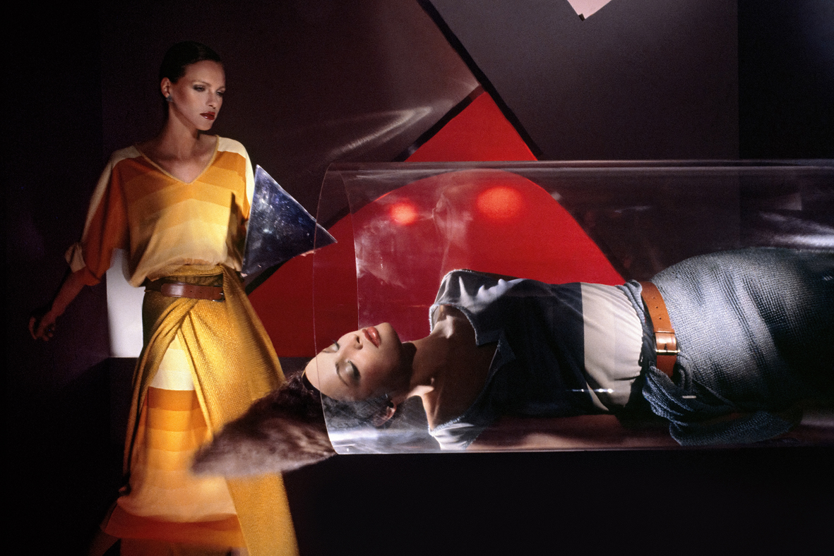 Gli scatti dei grandi maestri della fotografia di moda – Giampaolo Barbieri, Giovanni Gastel, Alfa Castaldi, Maria Vittoria Backhaus – e le illustrazioni di René Gruau, Sepo, Erberto Carboni, Franco Grignani, Guido Crepax, Antonio Lopez, Lora Lamm, oltre al lavoro particolarissimo e destabilizzante di Oliviero Toscani, restituiscono un’estetica che è insieme racconto pubblicitario e ritratto di un’epoca.