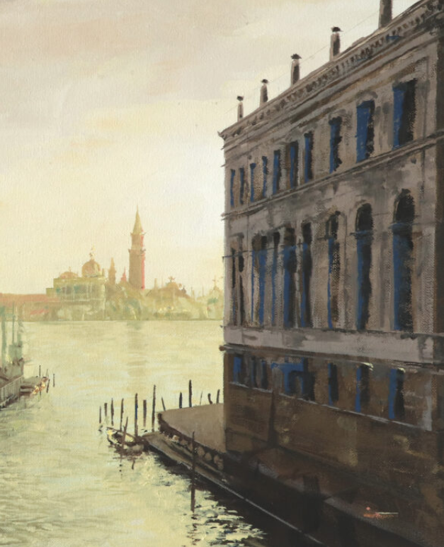 La seconda si concentra invece attorno ai paesaggi, sia naturali (in cui la natura rappresentata riporta alla forza resiliente della natura, alla sua capacità di esprimere speranza, bellezza inaspettata ed equilibrio tra sentimenti opposti) che legati direttamente a Venezia, città con cui Serrano ha un profondo rapporto e di cui immortala non solo la visibile magnificenza, ma anche la sua anima: la danza tra luce e ombra, la serenità delle sue acque in contrasto con il trambusto delle sue strade, l’immobilità della sua storia giustapposta alla vivacità della vita contemporanea. Queste opere incarnano l’essenza di Venezia, fondendo la sua iconica architettura con la bellezza dei suoi paesaggi urbani. Create in omaggio alla Biennale di Architettura, queste tele celebrano la città come spazio di creatività, innovazione e tradizione, riflettendo il suo inconfondibile fascino e il dinamico rapporto tra antico e moderno. Venezia, nel suo mistero e nella sua fragilità, è sempre stata una fonte inesauribile di ispirazione per coloro che cercano la bellezza sia nell’effimero che nell’eterno.