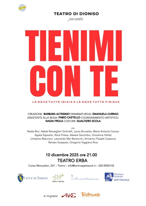 Lo spettacolo conclusivo del progetto, “Tienimi con te – le periferie dell’Anima” è a cura di Teatro di Dioniso e LiberamenteUnico, Michela Cescon, Barbara Altissimo, con la creazione/regia di BarbaraAltissimo, la drammaturgia di Emanuela Currao; insieme ad alcuni artisti in scena ci saranno persone comuni incontrate nei laboratori con la società civile.